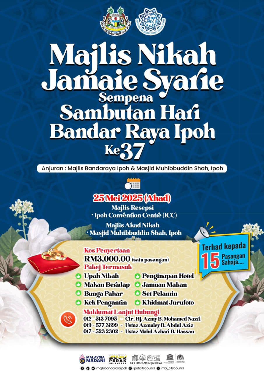 announcement Majlis Nikah Jamaie Syarie Sempena Sambutan Hari Bandar Raya Ipoh February 20, 2025 No Comments