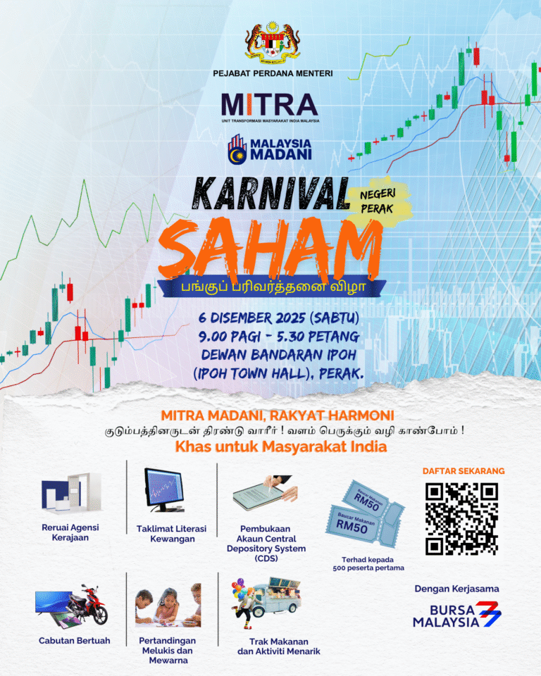 Khas untuk komuniti India di Perak — Karnival Saham MITRA kini tiba! Acara yang penuh informasi dan inspirasi ini bertujuan untuk meningkatkan literasi kewangan dan peluang pelaburan bagi masyarakat tempatan.
